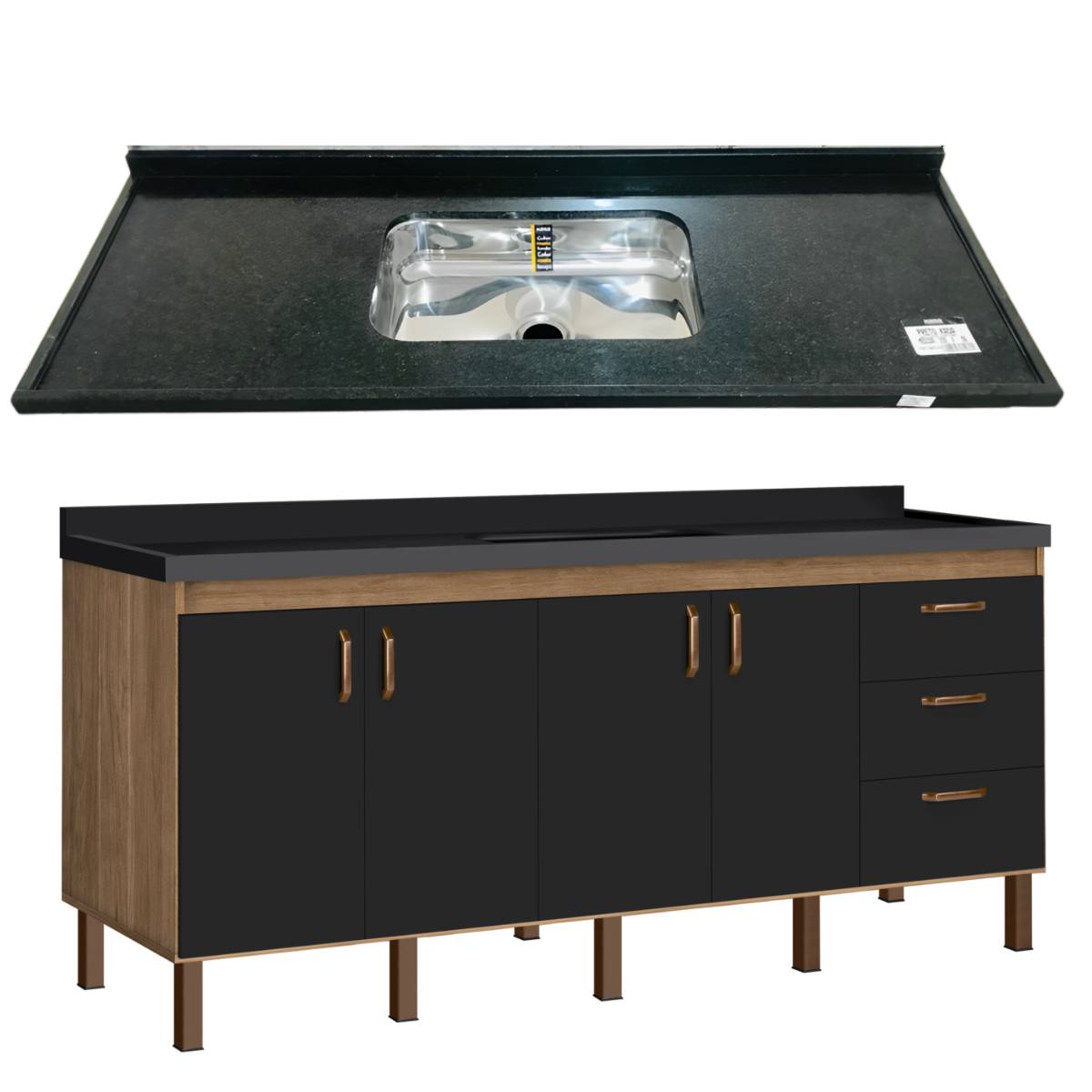 Esse Kit é maravilhoso juntamos o útil ao moderno, o modelo copacabana possui um excelente acabamento, cor acetinada, puxadores na cor cobre, corrediça telescópica, 4 portas e 3 gavetas, além de lindo, e adicionamos a pia Preto Kasa que trás aquela excelência ao conjunto.